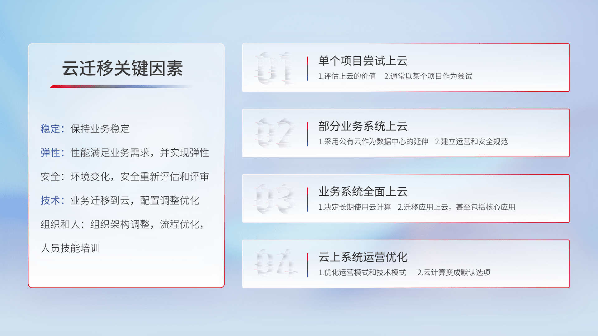 结合实际业务,,,从规划设计、、云平台选型、、云原生改造、、、数据迁移、、、、集成交付,,迁移全过程为客户识别最佳上云路径,,,,做好风险识别管理,,,设计网络架构、、、身份权限、、、、安全审计合规、、、、操作审计、、、日志审计、、监控告警策略、、、多站点容灾设计等,,,,对云上基础设施进行整体规划,,,提升IT治理水平,,,以满足弹性、、、、高可用、、高性能的需求。。。。
