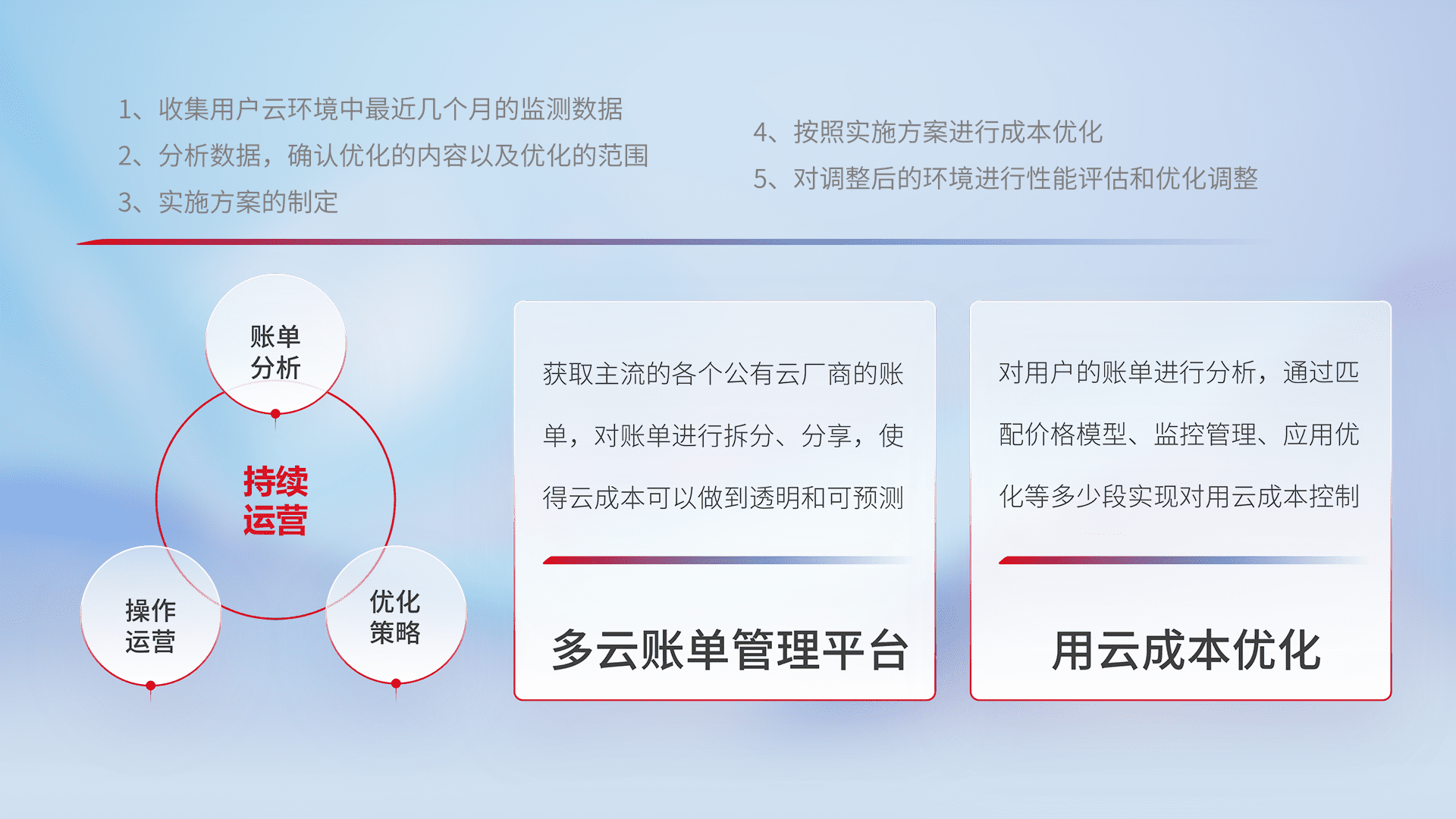 通过多云纳管,,以统一的资源数据模型把客户的云资源进行抽象和封装,,,进而实现对多云资源的统一操作,,保障云资源管理的可靠性、、、稳定性与可用性。。。量身定制化运维内容,,,配置、、、、开发运维、、、、补丁管理、、备份、、监控、、、认证和访问管理、、审计和日常巡检等,,保障在用云过程中的可靠度,,,稳定度以及高可用率。。。