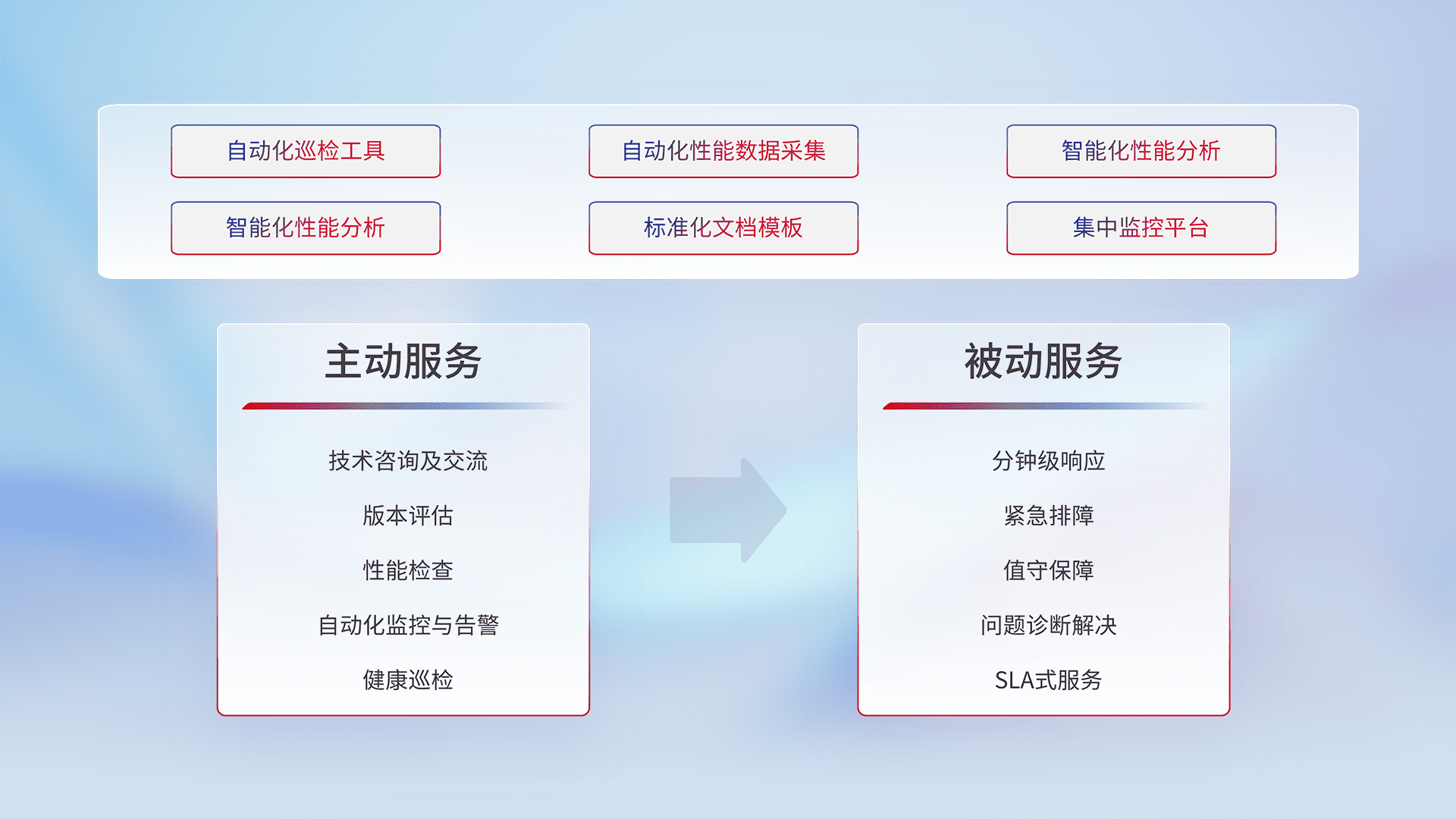 智能化工具和标准化文档,,保障服务质量,,,,提供主动服务(包含技术咨询、、、版本评估、、、、性能检查、、、自动化监控与告警、、健康巡检)和被动服务包含(分钟级响应、、、紧急排障、、值守保障、、、、问题诊断解决、、SLA服务)。。。。